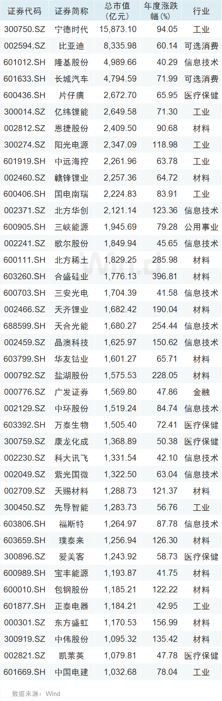 不仅仅是宁德时代,众多大市值新能源公司今年以来总市值提升明显。Wind数据显示,今年以来涨幅超过40%,且总市值超过1000亿元的公司有40家,市值前十的公司有宁德时代、比亚迪、隆基股份、长城汽车、片仔癀、亿纬锂能、恩捷股份、阳光电源、中远海控、赣锋锂业,只有片仔癀和中远海控属于非新能源产业链企业,其余公司均为新能源产业链龙头。