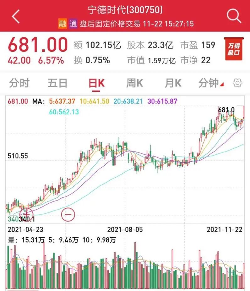 截至11月22日收盘,宁德时代上涨6.57%,报收于681元,总市值达1.59万亿,超越工商银行跃居A股市值第二。