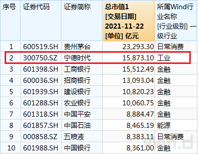 11月22日,宁德时代超越工商银行跃居A股市值榜第二名,仅次于贵州茅台,与此同时,从年度涨幅居前的千亿市值公司行业分布来看,超半数公司属于新能源产业链。