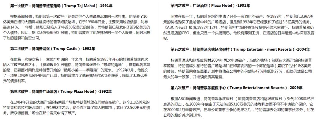 其中1990年开业特朗普泰姬陵赌场,仅1年后就陷入了将近30亿美元的债务,川普自己也累积了近9亿美元的个人债务,1991年便宣布破产。……