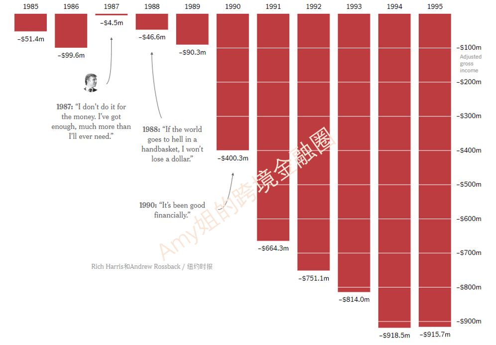 1985年到1994年,川普连亏10年,一年比一年亏的多。