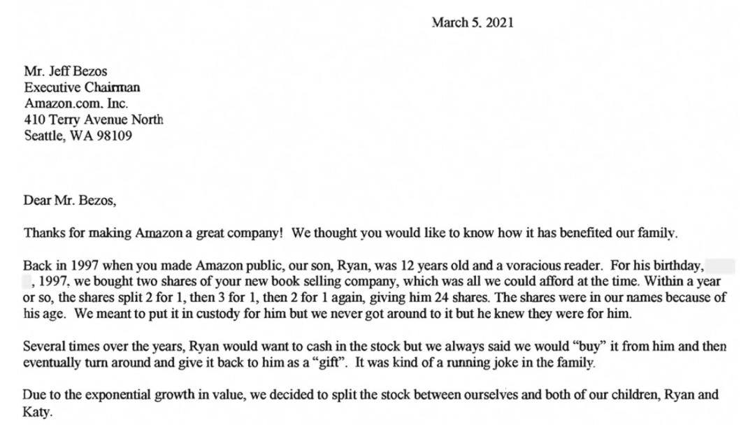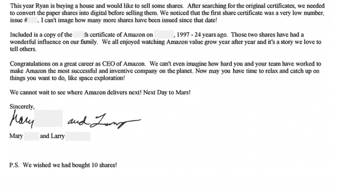 在亚马逊1997年的第一封致股东信中,我谈到希望建立“持久特许经营权”一事,也就是通过释放互联网的力量来重新定义“服务客户”的意义。我当时提到,亚马逊已经从158名员工发展至614名员工,我们的用户账户也超过了150万。我们刚刚上市,经拆股调整后的股价为每股1.5美元。我写道:那是第一天。自那时以来,我们走过了一段很长的路,我们也比以往任何时候都更加努力地服务和取悦用户。去年,我们雇佣了50万名员工,现在全球范围内的员工总数达到130万。我们在全球拥有超过2亿的Prime会员。超过190万中小企业在亚马逊上进行销售,占我们销售总额的近60%。用户已经将超过1亿台智能家居设备与Alexa相连接。云服务(Amazon Web Services, AWS)为数百万用户服务,截至2020年,年营收运转率达到500万美元。在1997年,我们还没有发明Prime、Marketplace、Alexa或是AWS。根本没人想过这些,它们的诞生也并非命中注定之事。为了每一件产品,我们都冒了很大的风险,也付出了很多智慧与汗水。一路走来,我们为股东创造了1.6万亿美元的财富。他们是谁?当然,我所持有的亚马逊股份使我变得富有。但超过八分之七的股份,也就相当于1.4万亿美元的财富,为他人所有。他们是谁?是养老基金、大学、401(K)退休福利计划,也是Mary和拉里,他们在我坐下来写这封股东信的时候,意外地给我发来了以下这封信: