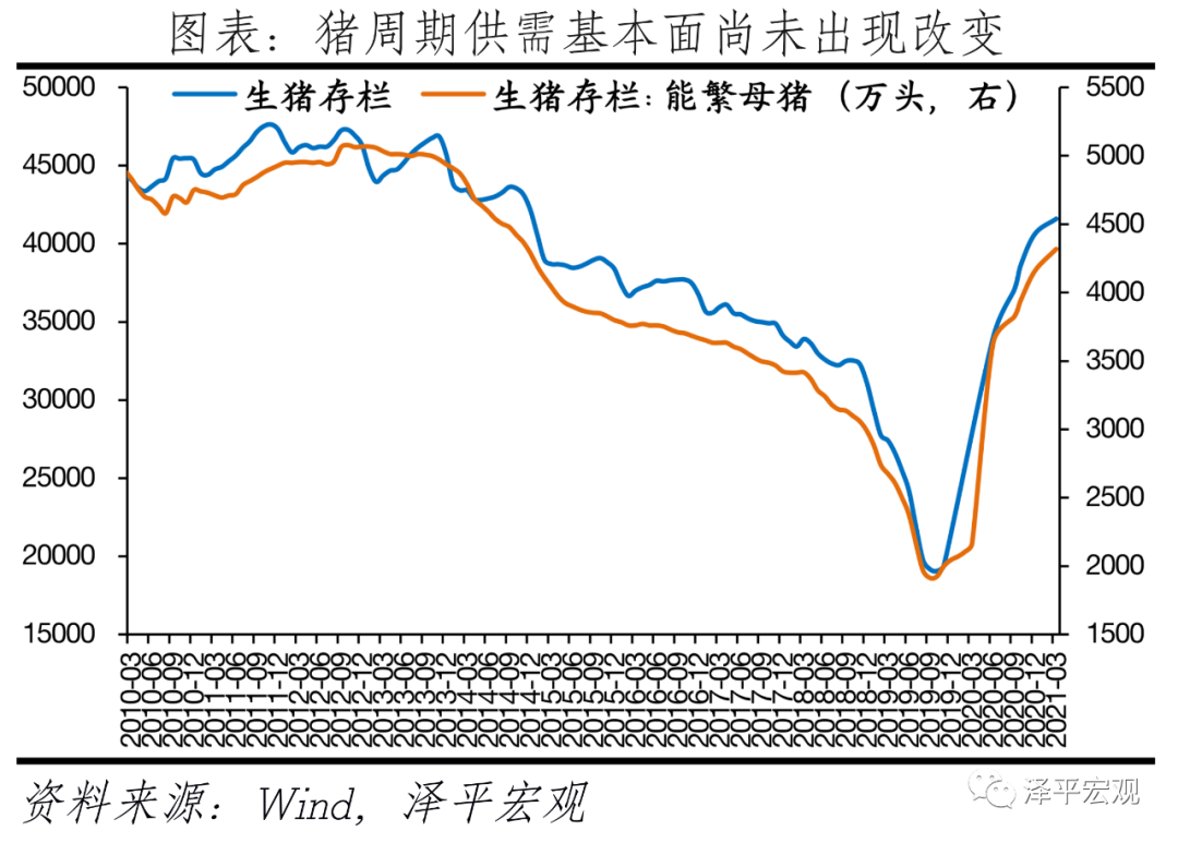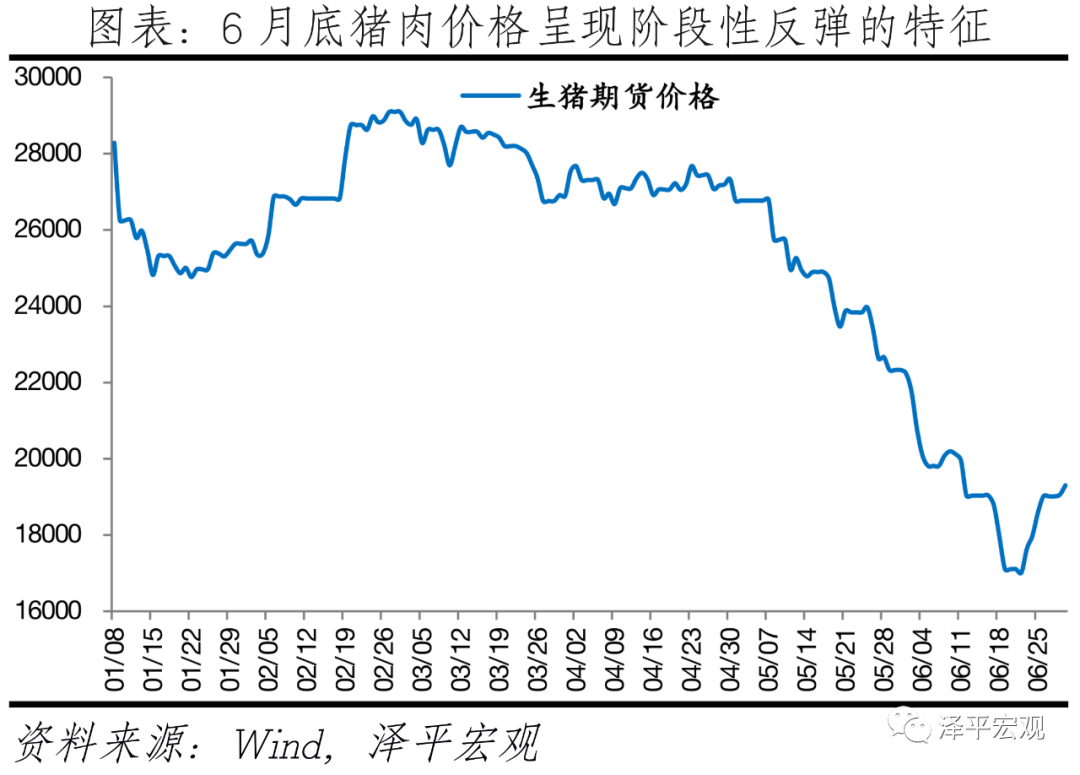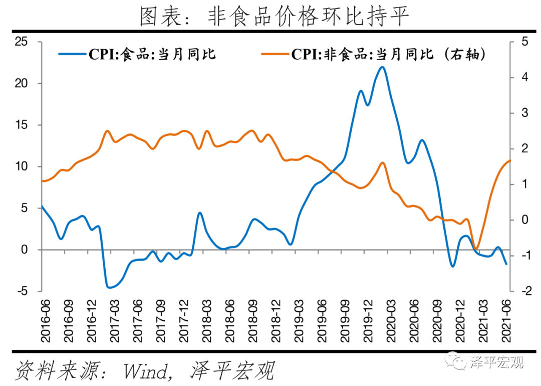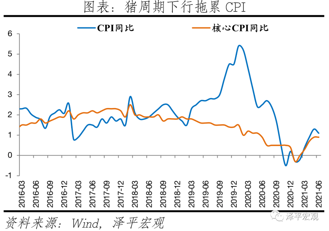 6月CPI同比上涨1.1%,较上月回落0.2个百分点;从环比看,CPI下降0.4%,降幅比上月扩大0.2个百分点。分项来看,食品分项为拖累项,主要是猪周期下行,本月猪肉价格影响CPI下降约0.80个百分点。非食品分项整体环比持平,居住、交通通信、其他用品及服务价格起拉动作用,交通通讯项尤其是受油价影响的交通燃料分项涨幅较为明显。6月剔除食品和能源价格的核心CPI同比涨0.9%,与上月相同。食品价格环比降1.4%,降幅较上月收窄0.3个百分点,影响CPI下降约0.39个百分点,主要受猪周期下行压制。其中,鲜菜价格环比降2.3%,鲜果价格环比降4.5%。畜肉类价格环比降7.6%,较上月环比6.0%降幅再度拉大;猪肉价格环比降13.6%,同比降36.5%,环比降幅比上月扩大2.6个百分点。本轮猪周期始于2018年中,2020年猪价开始震荡下跌。本轮猪肉价格受到非洲猪瘟、环保限产政策、猪周期内生上涨动能、规模化养殖等多重因素影响,显现猪肉价格涨幅大、速度快等特点。全国猪肉均批发价在2019年11月超过50元/千克高点,随后震荡下行。随着生猪产能加速恢复,猪周期进入下行阶段。生猪存栏量与能繁母猪存栏量均于2019年10月见底,此后持续增长,产能逐步提升。随着猪粮比低于5进入一级预警区间,后续需密切关注猪肉价格低位边际反弹对CPI的影响。非食品价格环比持平,比上月收窄。其中,交通工具用燃料环比涨2%,居住、交通通信、其他用品及服务价格环比上涨0.1%,医疗保健价格持平;衣着、生活用品及服务、教育文化娱乐价格环比下降0.2%。