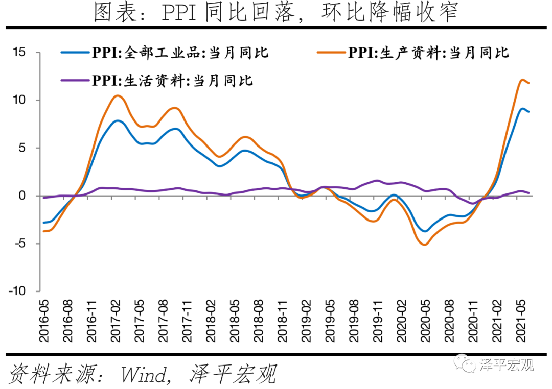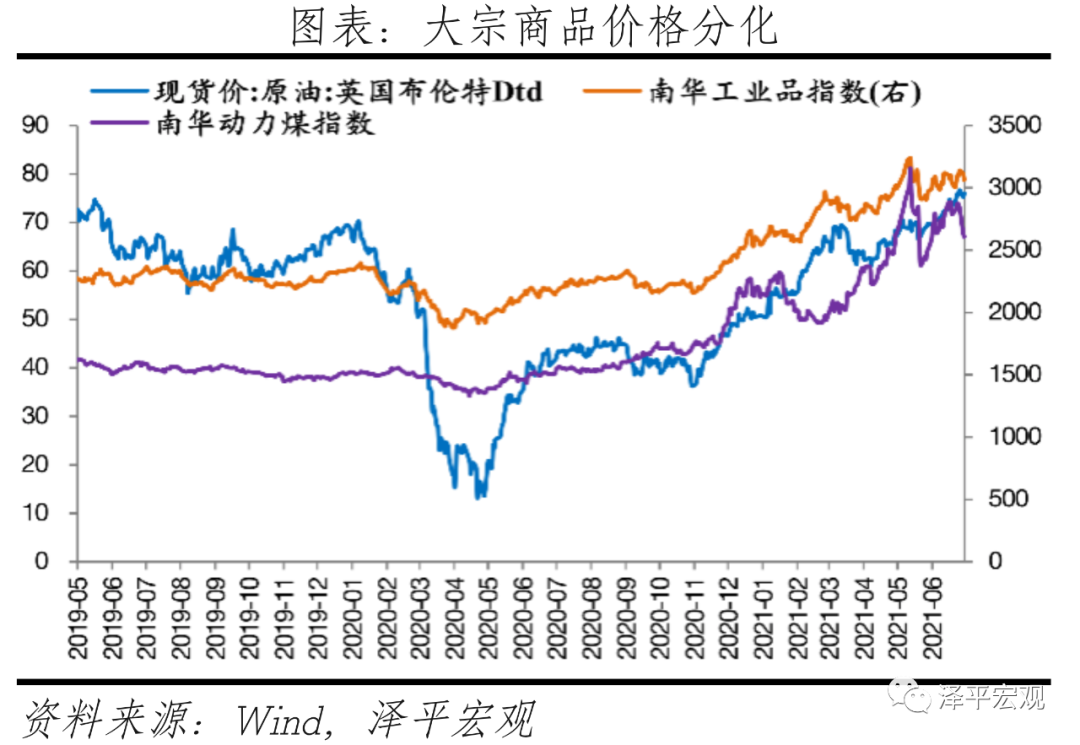 我们最新的判断是:大宗商品通胀的高点已现,经济将逐季放缓,现在处在经济周期的滞胀后期和衰退初期,今年下半年到明年上半年是两期转换时点,货币宽松周期的时间窗口正在打开,货币政策将对资本市场逐步友好。未来的货币政策周期四部曲:不急转弯 - 慢转弯 -转弯 -轰油门。中国6月PPI同比上涨8.8%,预期涨8.5%,前值涨9.0%;中国6月CPI同比上涨1.1%,预期涨1.2%,前值涨1.3%。1、通胀回落、经济韧性放缓、货币宽松周期的窗口正在打开6月PPI、PMI同比均自高点回落,全球大宗商品价格表现呈现分化态势,能源化工类价格保有韧性,工业金属价格回落。6月布伦特原油均价环比涨5.9%,南华螺纹钢环比-6.9%,LME铜环比-5.5%。较5月相比,6月工业品价格环比涨幅明显收窄。这验证我们的判断,大宗商品价格快速上涨阶段或已结束,高点临近,市场对货币政策收紧的预期和焦虑会逐步缓解,但欧美经济复苏、印度拉美深陷疫情所带来的供求缺口仍然存在,所以大宗商品价格短期可能高位盘整、品种分化。值得重视的是,疫情后经济呈现K型复苏,不仅体现在居民收入上,也体现在企业经营上,这对消费和制造业投资的恢复产生一定的负面影响。当前,大中小企业景气度分化、上下游企业利润率分化。中小企业经营恢复不牢固,叠加大宗商品上涨,成本抬升对下游、小企业利润压制尤为突出。1-5月采掘业、上、中、下游制造业利润两年复合增长率分别为15.3%、31.3%、22.4%和4.1%。站在周期角度,我们现在处在经济周期的滞胀后期和衰退初期,今年下半年到明年上半年是两期转换时点,经济将逐季放缓,房地产和出口是主要拖累,宽松周期将来未来。未来的货币政策周期四部曲:不急转弯 - 慢转弯 -转弯 -轰油门。对今年下半年到明年上半年的经济下行压力要有预判和准备。未来的货币政策周期和所有新事物一样,将经历:看不见- 看不起 -看不懂 - 来不及。我国经济周期比美国领先三个季度左右,下半年美国将从复苏转入过热,6月FOMC议息会议释放收紧信号,或将在三季度讨论缩减购债规模。央行决定于7月15日下调金融机构存款准备金率0.5个百分点。我国货币政策保持独立性,以我为主,从“稳货币、结构性紧信用”转向“稳货币、稳信用”格局。2、大宗商品超级通胀高点临近,未来高位盘整、品种分化6月全球大宗商品价格表现呈现分化态势,能源化工类价格保有韧性,工业金属价格回落。疫情带来的出行限制压力缓解、消费场景放开、美国复苏进程由商品端消费转向服务端、部分欧美国家谨慎放宽跨境旅行限制,支撑油品需求加速回暖,6月布伦特原油均价环比5.9%。但受国内“保供稳价”和防止过度炒作大宗商品政策影响,6月南华螺纹钢环比下跌6.9%;受海外货币政策预期收紧以及商品消费边际放缓影响,6月LME铜环比跌5.5%。当前全球处于供需再平衡初期。从需求端看,美国经济从复苏转向过热,未来经济修复的重心将转移到服务,财政补贴高峰后商品消费端需求增速正在放缓;中国经济处于滞胀后期和衰退初期。从供给端看,美国供给持续修复,耐用品累库上升;新兴经济体产能处于逐步恢复进程之中,供给边际不足情况将有所缓解;国内政策强化保供稳价,国内定价的钢铁、煤炭等大宗商品价格上涨空间有限。站在产能周期角度,当前美国产能利用率接近疫情前水平,增幅趋于放缓,供需缺口正在修复,对大宗价格拉动效果有所放缓。1)在出现阶段性外部冲机后,如2020年全球疫情冲击、2008年金融系统冲击,经济进入衰退期,存量产能阶段性的快速出清,产能利用率迅速下滑。2)而后在逆周期政策调节作用下,经济开始复苏,需求端以较快速度修复,而供给端由于前期被动出清导致边际供给不足,供需缺口阶段性的迅速拉大,这一阶段也会对大宗商品工业品价格快速上行起到拉动作用。3)而在经济修复进一步深化后,工业产能利用率同比变动也处于相对高位,物价处于较高水平,经济进入过热和滞胀阶段,全球经济供需端面临再平衡。4)随着产能利用率接近冲击以前高点,供需缺口边际收窄,产能利用率绝对水平维持高位,但增幅趋于放缓,因此对大宗价格拉动效果明显放缓。与2009年相比,本轮因疫情产生的生产供应限制对供给端冲击更深,因此供需缺口维持时间会更长,大宗商品价格高位盘整时间或会更长。叠加中国碳达峰碳中和等带来的供给约束、长期落后产能出清、全球优质资源稀缺性等问题,长期来看大宗价格运行中枢边际抬升。国内PPI对CPI的传导正在显现,但是受终端需求温和复苏影响、叠加此前猪肉价格周期下行,PPI向CPI传导整体并不畅通,但拿掉猪以后都是通胀。6月国内PPI同比8.8%,CPI同比1.1%,PPI同比和CPI同比都较上月回落0.2%,PPI-CPI剪刀差前期走扩后当前仍维持较高水位。从分项看,CPI食品和非食品项分化仍存在,6月CPI非食品价格同比1.7%,而食品项同比负1.7%,食品项环比连续4个月下滑;6月PPI生活资料价格涨幅环比下滑0.2%,同比涨幅0.3%,远不及生产资料涨幅。当前美洲干旱天气对农产品价格和国内CPI影响相对可控,后续需要关注干旱面积是否继续扩散。6月末CBOT大豆、豆粕、豆油、玉米价格自低点分别反弹9%、5%、16%、14%。中国大豆进口贸易占比在80%以上,豆价内外联动性较强,但美国豆作物带主要集中在北部、中西部和部分南部地区,西部干旱对豆作物影响不大。中国玉米进口占比低,且多进口自乌
