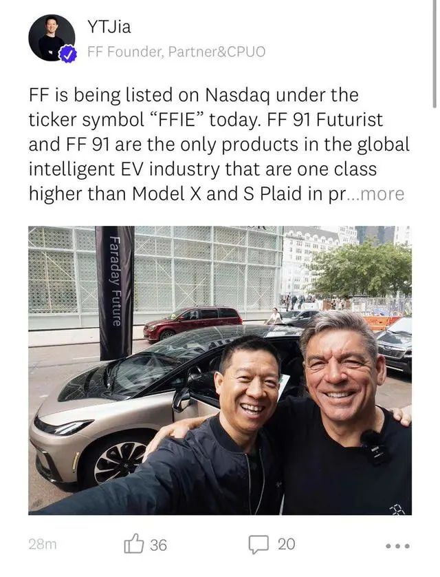 作为FF公司的创始人、合伙人、首席产品及用户生态官,贾跃亭出席了上市庆祝活动,并在社交平台更新动态表示:“上市是我们最期待的时刻。FF不仅是一家电动汽车公司,也是一家互联网、科技、人工智能产品、软件和用户生态系统公司。在我们追求成为全球市场金字塔顶端的目标时,我们将颠覆传统的超豪华品牌。”