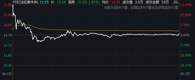 7月22日,法拉第未来(Faraday Future,下称“FF”)终于在纳斯达克挂牌上市。股票代码为“FFIE”,这也是FF与PSAC合并后公司的名称的缩写——“Faraday Future Intelligent Electric Inc.”。“FFIE”发行价13.78美元,此前的美股盘前交易时段,FFIE涨超44%,报19.6美元,但开盘后报16.8美元,上涨22%,随后股价走低一度破发,截至收盘,FFIE股价为13.98美元,涨幅仅1.45%,总市值45.11亿美元,约合人民币近300亿元。