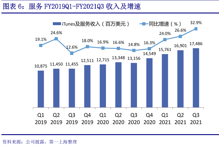 iCloud可存储的内容包括App数据(仅限于部分App)、设备设置、iMessage信息、文件、照片和视频等。苹果三季报显示,其服务收入为175亿美元,同比增长32.9%,收入占比21.5%。苹果服务收入包括了广告、AppleCare、iCloud、订阅服务(Apple TV+、Apple Music)以及支付服务。近年来其服务收入增速维持在20%左右,远高于其硬件收入。