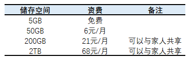 目前市场上针对个人用户的云存储服务提供商主要以互联网头部公司、电信运营商和智能手机厂商为主,主流服务商包括苹果iCloud、百度网盘、QQ、华为云等。根据苹果iCloud 储存空间方案,用户注册iCloud时便会自动获得5GB的免费储存空间,如果用户需要更多iCloud储存空间,可以选择升级到更大的储存空间方案,具体资费如下表所示: