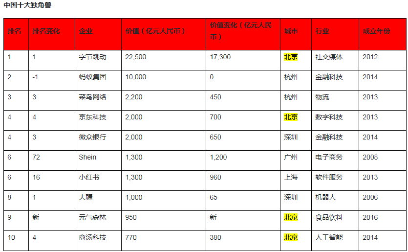 北京不但独角兽企业数量多,而且拥有的独角兽实力也超强,比如估值全球第一的字节跳动,就在北京。京东科技、元气森林、商汤科技这些中国独角兽10强公司,也都在北京。