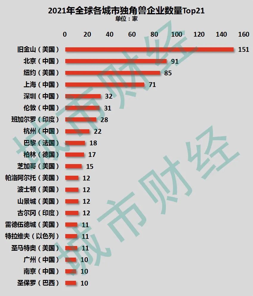 旧金山这么牛,是因为这里坐拥全球最能打的高科技产业园区硅谷。硅谷曾孵化出了一批全球顶级科技、互联网公司,包括谷歌、Facebook、惠普、英特尔、苹果公司、思科、英伟达、甲骨文、特斯拉、雅虎。浓烈的科技创业氛围,让这里每年都会孵化出一批优秀的企业。2021年旧金山一口气增加了83家独角兽企业,也就是说美国去年增加的254家独角兽企业,有三分之一的增量是旧金山贡献的。独角兽城市前5强中,美国2个,中国3个,京沪深跻身全球独角兽5强城市,再一次向世人昭示,北京、上海和深圳,是中国最能打的三个城市。前21强城市中,广州和南京也位列其中,各有10家。第四、京沪深三甲,深圳甩开杭州,广州超越南京,苏州晋级10强。从国内独角兽企业分布来看,尽管北京独角兽企业较去年减少了2家,依旧位列第一,上海、深圳独角兽企业位居第二、第三。
