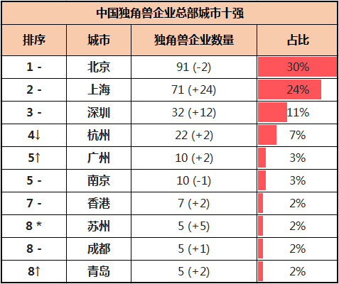所以说,尽管在GDP层面上,上海是中国经济第一城,但论硬实力,北京堪称中国最牛城市,没有之一。中国独角兽10强另外6家,深圳2家,杭州2家,上海、广州各1家。从增量可以看到,上海今年一口气增加了24家,也即一口气增加的独角兽企业数量,比杭州的独角兽企业总量都要多。增量第二的是深圳。深圳最大优势,是市场化程度和营商环境,这里是民营企业的乐土,具备了孵化企业一切的要素。2021年,深圳独角兽企业增加了12家,相当于增加了一个多广州或南京。在12家增量助攻下,拉开了与杭州的差距。去年,深圳和杭州的独角兽企业数量相等。杭州、广州、南京、青岛、香港各增加2家,成都增加1家。广州在2家增量助攻下,再加上南京较去年减少了1家,排名超越了南京。苏州今年独角兽企业增量位居第三位,仅次于上海和深圳,增加了5家。凭借着5家增量,苏州也一跃晋级为中国独角兽企业10强城市。