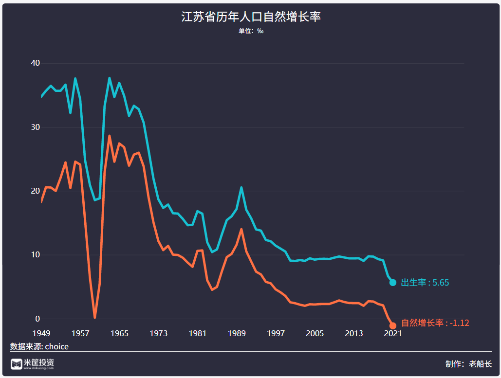 2021年,江苏人口出生率5.65‰,死亡率6.77‰,导致人口自然增长率为-1.12‰。这是新中国成立以来,江苏人口自然增长率第一次转负。按照自然增长率计算,江苏去年人口减少9.51万,但其总人口还是增加了28.1万人。也就是说,江苏的人口净流入达到37.61万人,是5年来的新高!2016-2019年,江苏每年新出生人口都在70万以上,但到了2020和2021年,出生人数连续跌破60万和50万。2021年,江苏65岁以上人口占比17%,早已进入深度老龄化阶段。