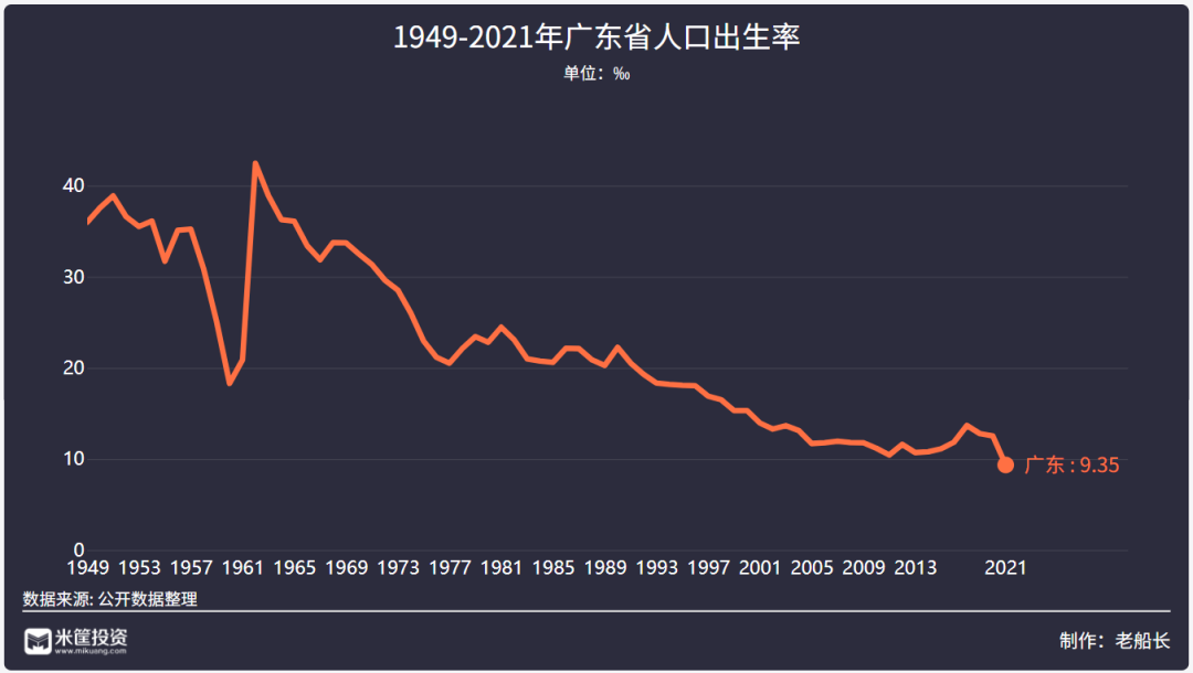 1962年,广东出生率创下历史新高的42‰,到2000年时还保持着15‰的高增长。制造业为主的产业结构,需要大量年轻人进入工厂,导致广东的人口结构极为年轻,尤其是深圳、东莞、佛山这样的城市。加上宗族制度兴盛、传宗接代的传统思想,让广东的出生率一直保持高位。但从1991年开始广东出生率便逐年下降,直到2021年跌破10‰。