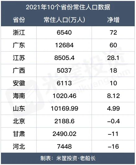 2021年,广东常住人口1.26亿,仍是中国第一人口大省,但增量下降到60万人。而浙江,2021年增量达到72万!10年来第一次超过广东。而浙江,自然增长人口只有6.5万人,也就是说,去年浙江的人口净流入量达到65.5万人。2月份浙江公布的抢人新政,大学生创业失败政府可以代偿10万,更是引起一阵惊呼。