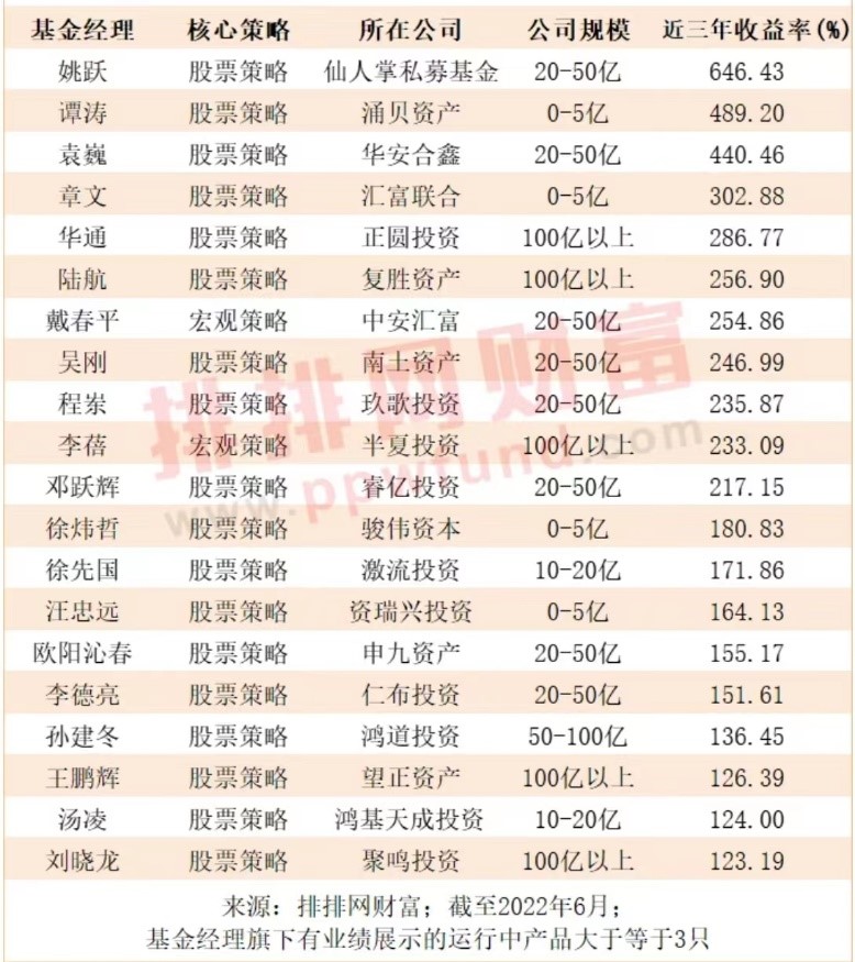 根据私募排排网数据,公募派基金经理近三年、近五年的平均收益为82.09%、99.98%(均取旗下有业绩展示的运行中产品大于等于3只的公募派基金经理数据)。近三年业绩表现居前的公募派基金经理有仙人掌私募基金姚跃、涌贝资产谭涛、华安合鑫袁巍、汇富联合章文、正圆投资华通、复胜资产陆航、中安汇富戴春平、南土资产吴刚、玖歌投资程岽、半夏投资李蓓等。