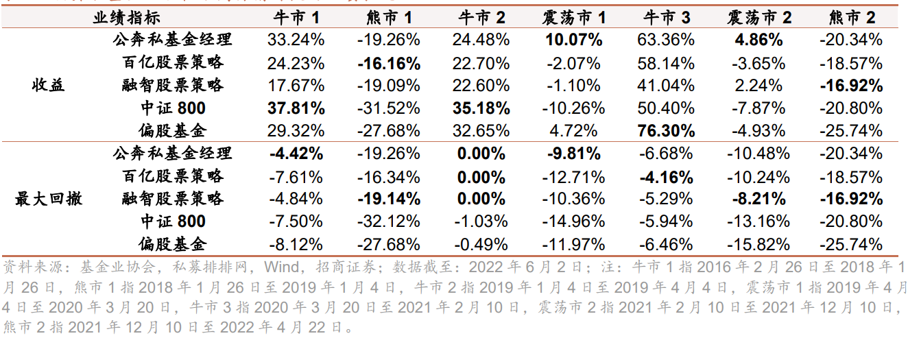 从公奔私基金经理在不同市场行情下的业绩表现看,牛市中能够跑赢百亿私募,震荡市中获得相对市场和同类平均显著的超额收益,熊市中跌幅小于市场指数,且回撤控制能力在各市场行情中均优于公募偏股基金和市场指数。