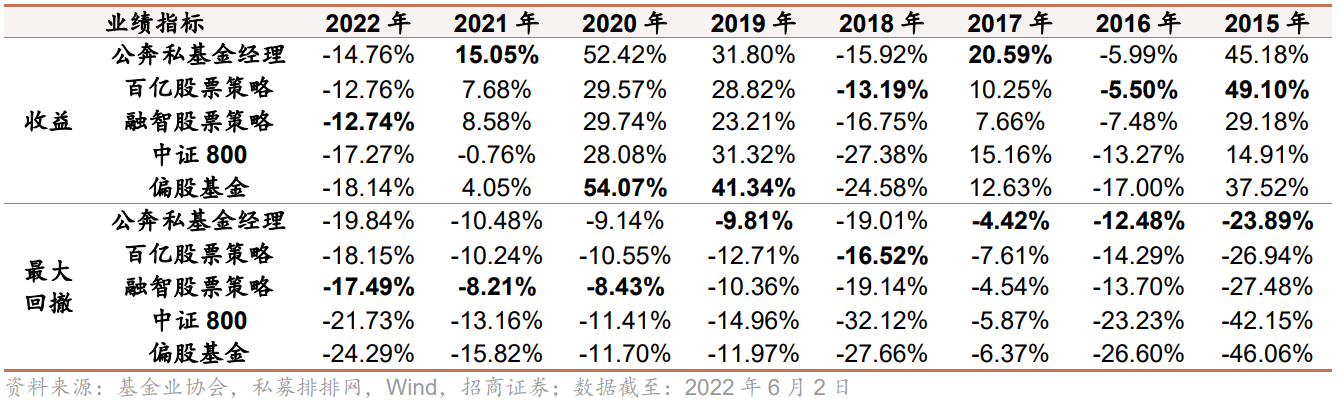 从收益表现看,近 8 年公奔私基金经理每年收益均跑赢中证 800,且有7 年跑赢同类平均,6年跑赢公募偏股基金指数,收益稳健,业绩持续性较强。从风险控制角度看,公奔私基金经理各年度最大回撤基本与同类平均相当,显著低于市场指数和公募偏股基金。