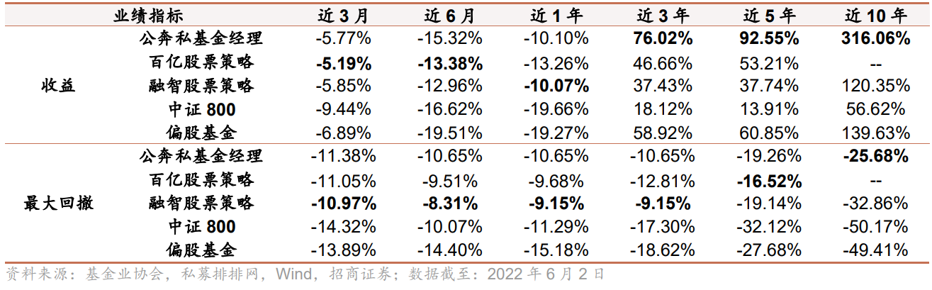 从收益表现来看,公奔私基金经理短期业绩表现相对稳健, 近 3 月、近 1 年跌幅与融智股票策略指数3相当,表现优于公募偏股基金和市场指数;长期来看,公奔私基金经理业绩突出,近 3 年、近 5 年、近10年收益大幅跑赢百亿股票私募和市场指数,分别达 76.02%、92.55%、316.06%。 从风险控制角度来看,公奔私基金经理回撤控制相对较好,各个时间维度的最大回撤基本均小于市场指数和公募偏 股基金,近 10 年最大回撤远低于私募同类平均水平。