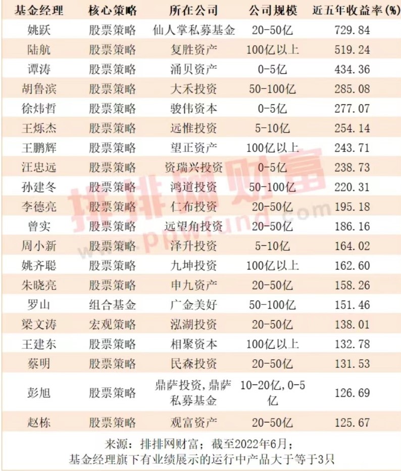近五年业绩表现居前的公募派基金经理是仙人掌私募基金姚跃、复胜资产陆航、涌贝资产谭涛、大禾投资胡鲁滨、骏伟资本徐炜哲、远惟投资王烁杰、望正资产王鹏辉、资瑞兴投资汪忠远、鸿道投资孙建冬、仁布投资李德亮等。