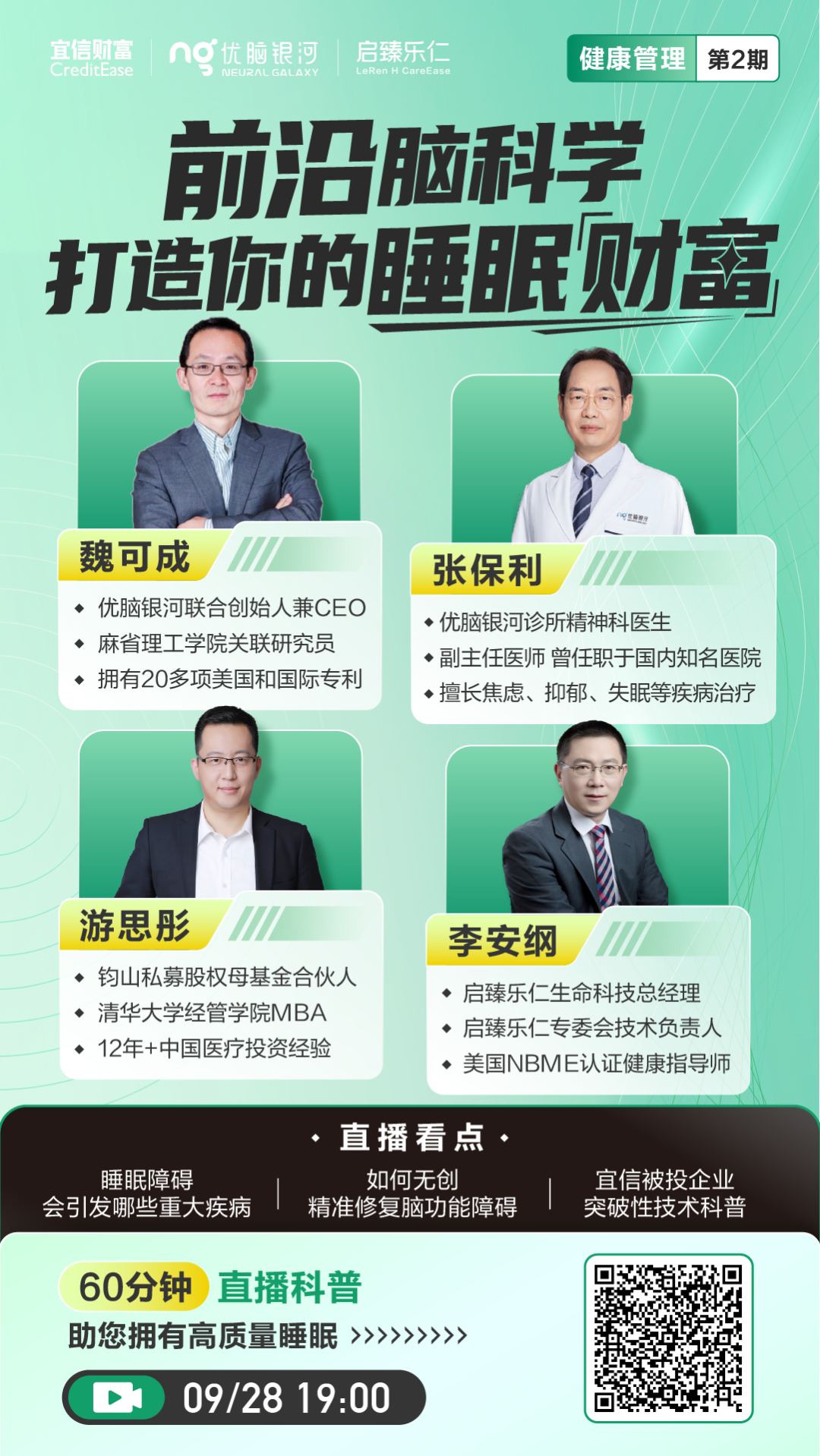 优脑银河作为宜信生态圈伙伴,是脑科学领域的前沿科技公司,以“突破脑认知、攻克脑疾病”为使命,致力成为全球最具社会价值的脑科技公司。今天晚上19:00,两位优脑银河权威专家&医疗领域资深投资人&医疗健康行业资深专家将会坐客直播间,共同探讨前沿脑科学技术。