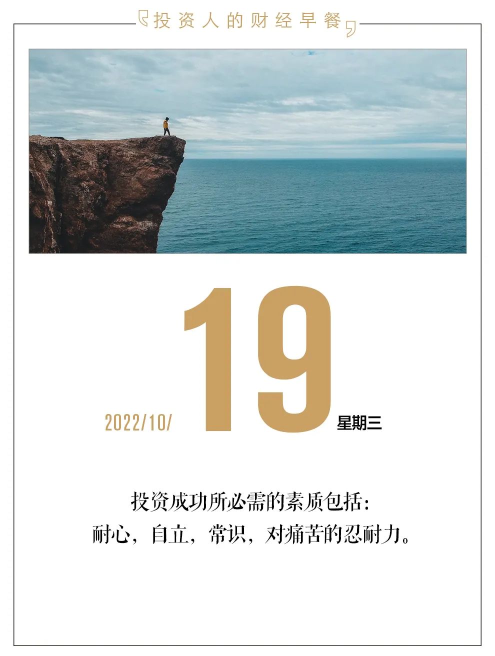 国内 ■ 多地首套房贷利率降至4%以下,四季度房地产市场有望加速修复 9月底,中国人民银行接连两天出台降低首套房贷利率的政策,包括下调首套个人住房公积金贷款利率、阶段性放宽部分城市首套住房贷款利率下限。自上述政策发布后,已经有多个城市的首套房商贷利率降至4%以下。另外,多个城市也下调了首套个人住房公积金贷款利率。业内人士认为,随着楼市政策利好释放,地方因城施策逐步深化,对于提振房地产市场行情意义重大,有利于促进刚性和改善购房需求释放,四季度房地产市场有望加速修复。(证券日报) ■ 李家超:首份施政报告聚焦发展经济改善民生 据香港特别行政区政府新闻网消息,香港特别行政区行政长官李家超将于10月19日上午11时在立法会发表施政报告。李家超表示,他将于任内首份施政报告提出发展经济、改善民生的政策和措施,包括处理土地房屋问题、增强香港竞争力等。 国外 ■ 欧洲需求旺盛,取暖小家电出口激增 据报道,9月起电热毯和取暖器订单出现临时追加现象。业内人士指出,在欧洲能源紧张的背景下,取暖小家电需求有望持续升温。在众多取暖小家电中,电热毯依靠低能耗、使用便携等特点,成为欧洲多国居民今年冬季取暖的一大“利器”。生产商彩虹集团股价近期成为市场追逐热点,自9月21日以来收获了8个涨停板。彩虹集团在二级市场被关注的背后,是由于欧洲能源价格大幅上涨,取暖小家电需求明显提升,中国相关产品的出口额实现高增长。(中证报) ■ 规则修订提振市场信心 A股现回购增持热 日前,中国证监会、沪深交易所就修订上市公司股份回购、增持规则公开征求意见,修订内容包括放宽新上市公司回购实施条件、优化禁止交易“窗口期”的规定等。业内人士认为,回购增持相关规则的修订,将进一步激发上市公司进行股份回购的积极性,提升董监高增持公司股份的灵活度与便捷性。同时有利于改善当前市场情绪,提振市场信心,促进资本市场平稳运行。截至10月17日,A股市场3天内共有90余家公司披露了回购增持计划或回购增持进展情况。中金公司研报显示,2022年A股年度回购金额已创历史新高。(经济参考报) ■ 主流宽基受青睐 A股ETF近一月吸金414亿元 近期市场震荡回暖,医药、畜牧养殖等行业表现亮眼,相关ETF涨幅居前。以区间成交均价估算,截至10月16日,9月17日以来,共有414亿元资金净流入A股ETF,尤其是沪深300、中证500、创业板指等主流宽基指数ETF,被资金大举加仓。半导体、券商相关行业ETF也受到资金青睐。(中国证券报) ■ 三季度汽车行业融资超30起 自动驾驶、芯片和智能底盘站上风口 据不完全统计,今年三季度,汽车行业累计披露了33起融资事件。从融资方向看,自动驾驶依然是热点,此外,伴随着智能化变革的深入推进,车载芯片和智能底盘领域也受到资本关注。近年来,智能汽车的智能水平和整体算力不断提升,从自动驾驶到智能座舱,再到汽车域控制器,芯片算力成为关键胜负手和根本驱动力。在此背景下,车载智能芯片自然成为资本竞相追逐的新宠。在刚刚过去的三季度,车载高性能芯片和车规级MCU两大领域亦迎来投融资热潮,包括芯擎科技、黑芝麻智能、芯砺智能、芯旺微电子、寒武纪行歌和地平线等多家企业斩获新投资。 中信证券:我国通胀压力相对较低 资本流出压力有限 中信证券研报指出,新兴经济体与发达经济体此轮均由于通胀压力以及汇率贬值压力而开启货币紧缩,当前即使各经济体央行跟随美国加息,高通胀导致贸易情况恶化,叠加美元强势仍导致各国货币贬值压力较大。在此背景下,我国通胀压力相对较低,资本流出压力有限,货币政策仍可以保持独立性。考虑到全球加息潮对于我国总量货币政策窗口期的限制,未来经济稳增长或主要依靠结构性货币政策、财政和宽信用政策发力。 银河证券:A股市场10月将进入企稳反弹的区间震荡时期 银河证券指出,当前A股底部特征明显,虽然外围环境仍有不确定性因素扰动,但无需过度担忧。A股的韧性及其价值性凸显,会议密集期关注政策预期,同时是三季报的窗口期,当下抓住机会,低位布局。当前市场并不怕下跌,因为下跌即是机会,用平常心看待市场震荡,情绪是有周期的,认为10月将进入企稳反弹的区间震荡时期。短期关注受三季报预期利好+有政策预期的优质个股,中长期需持续关注相关行业景气度,配置估值较低的板块中业绩较好的优质个股,等待估值修复。 中原证券:短期市场有望企稳回升,重点布局预期改善的超跌板块 国盛证券:维持地产开发板块“增持”评级 景林资产:优质公司当下应重仓买入,港股目前估值极度便宜 景林资产表示,当前时点投资者对于中长期市场表现反而不必过度悲观。在此之中,“港股目前估值极度便宜,上涨空间很可能大于下跌风险,风险调整后收益已极具吸引力”。A股、港股投资者此前的极端预期,正在边际上出现扭转,市场预计即将寻找到业绩底部,政策面也逐步回暖,且估值接近底部。对于经历周期、保持并增强了核心竞争力的优质公司,建议重仓买入并长期持有。 ■ 华为专利可基于司机手势控制驾驶 华为技术有限公司申请的“一种车辆控制方法及装置”专利获授权。摘要显示,本申请可基于驾驶员的手势操作识别驾驶员的驾驶意图,并根据驾驶意图实现对车辆的驾驶状态的进行控制,提供了更加灵活